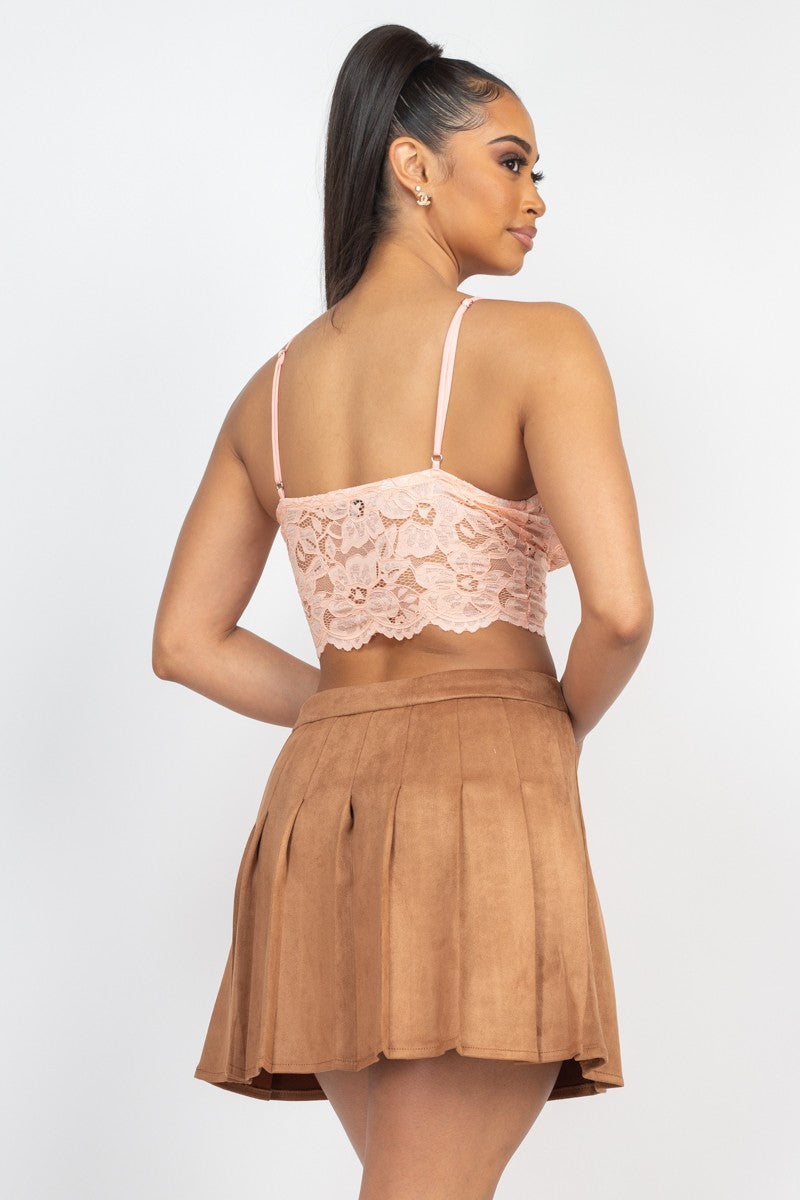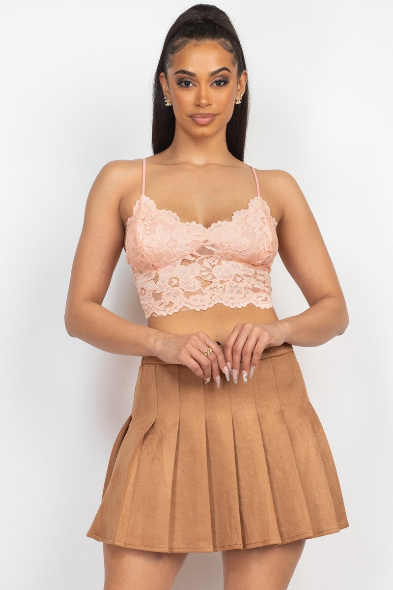 A knit bralette top in a lace design featuring floral lace pattern, mesh, padded, scallop trim hem details, adjustable cami straps, and cropped length.