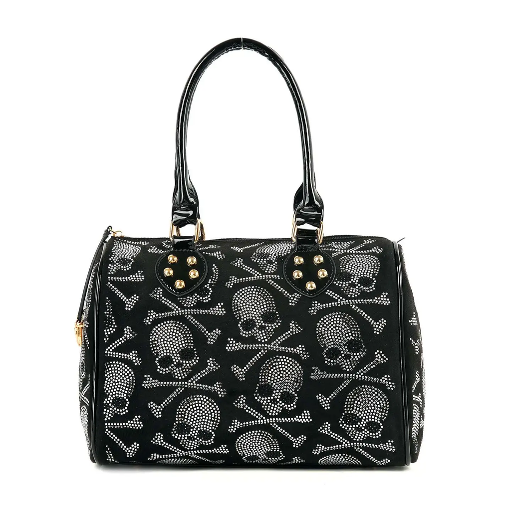 Luxe faux-leather and a sparkling rhinestone covered silhouette. This locked Leather satchel adds instant sophistication to any outfit.