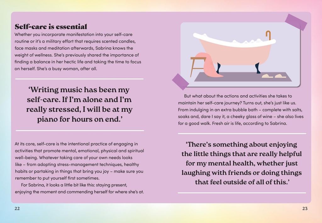 With chapters on her career Era of the Pop Princess, how we can sprinkle Sabrina magic in our own lives Please, Please, Please be Authentically You, and her dazzling fashion Have a TASTE, there's something for everyone- whether you're a early fan or have just fallen under her spell